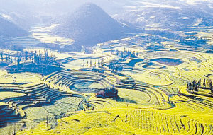 名扬天下,在县北10公里,由串珠岩溶地质地貌构成,从山顶俯瞰,梯田层层似螺丝旋纹,以弓形、半圆形放射性展开,似金龙盘卧,初春油菜花美不胜收。