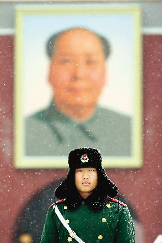 2月18日,武警冒雪在北京天安门金水桥前站岗。当日是雨水节气,我国中东部地区出现大范围雨雪天气,北方冬麦旱区旱情将得到进一步缓解。 新华社发 卓恩森 摄