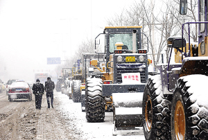 2月19日,除雪车辆在沈阳街头严阵以待。继2月13日遭遇25年来同期最强降雪后,辽宁省从19日凌晨开始又迎来了新的降雪过程,此次降雪导致辽宁省境内十几条高速公路陆续封闭。据沈阳中心气象台预报,19日至20日,沈阳、抚顺等地区有大到暴雪。