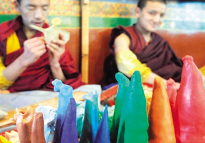 2月19日,拉萨贡德林寺的喇嘛们忙着做酥油花彩板。随着藏历土牛新年(2月25日)的临近,拉萨市僧俗群众开始忙着准备各种供品和年货,迎接新年的到来。 新华社记者 索朗罗布 摄