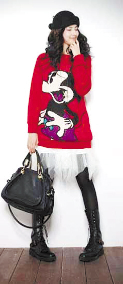 大红罩衫的宽松设计自由随性,正面硕大的卡通图案打破了平凡枯燥,同时使整体充满童趣,与黑色系带靴搭配,自由的气质立现。