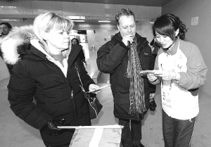2月24日,来自哈尔滨师范大学的志愿者刘思迪(右)为外国观众指路。在第24届世界大学生冬季运动会中,为赛事提供各种服务的志愿者们默默工作,被不少观众赞誉为赛场边“最可爱的人”。 新华社 发