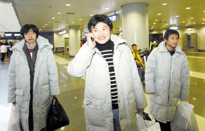 2月25日,李广超(中)在打电话报平安。当日,“新星”号货轮沉没事件中获救的3名中国船员李广超、刘峰和宋进抵达北京首都国际机场。2月15日,挂塞拉利昂旗的“新星”号中资货轮在俄罗斯远东港口城市纳霍德卡附近海域遭俄罗斯边防舰艇炮击,致使该货轮沉没,7名中国籍船员失踪,另3名中国船员获救生还。 新华社发