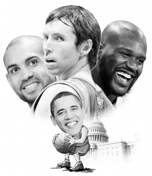 为了体现公平,希尔说他们将为这场比赛制定一个特殊规划,那就是不允许奥尼尔在内线投篮。希尔还透露:“我们有可能会让纳什去防奥巴马,这有点像美国对加拿大的比赛。不过,加拿大可能会赢得这场比赛。”这场特殊的“三对三篮球挑战赛”肯定吸引全世界的眼球,只是不知道届时会不会向全球直播。奥巴马及其队友的身手如何,且让我们拭目以待。