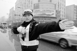2月26日早上,一名交警在雪中指挥交通。当日,一场瑞雪给期待已久的人们带来了意外惊喜,但也给市民的交通带来不便。市交警支队民警提前上岗执勤,全力疏导交通,确保市区安全畅通。