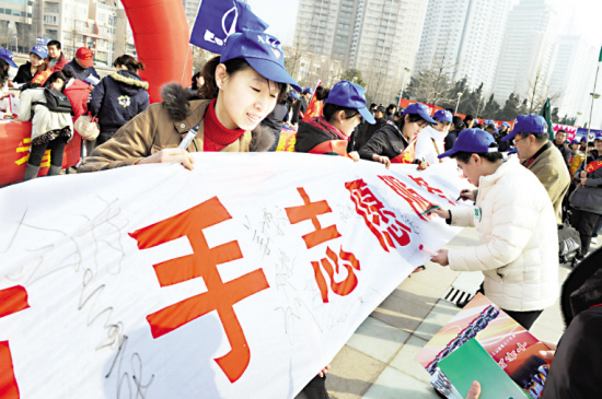 3月1日,几名志愿者正在“牵手志愿服务”横幅上签名。当日,来自青岛市各行业的68个志愿者组织在五四广场开展了丰富多彩的便民服务活动,而志愿者彼此之间也借这一机会相互交流学习,取长补短共同提高志愿者服务水平。 新华社记者 李紫恒 摄