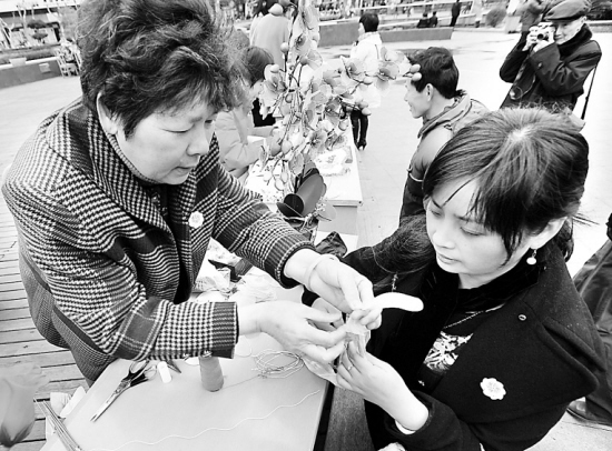 3月1日,舟山市巾帼爱心服务队的队员(左)在教授丝网花制作工艺。 当日,浙江省舟山市近千名女性党团员组成爱心、健康、金融、法律援助、文化、科技6支巾帼服务队,将开展一系列社会公益活动。 新华社发