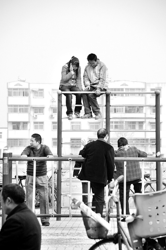 昨天,在滨河公园里,一对男女坐在两米多高的健身器材上,说说笑笑,很是甜蜜。值得提醒他们的是,这种行为既危险也不文明。晚报记者 朱海龙 摄