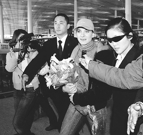 3月1日,女子撑杆跳世界纪录保持者、俄罗斯运动员伊辛巴耶娃(右二)步出首都国际机场。当日,伊辛巴耶娃抵达北京。她将在此后的三天内与李宁公司签约,参加学校公益活动,并游览长城。 新华社 发