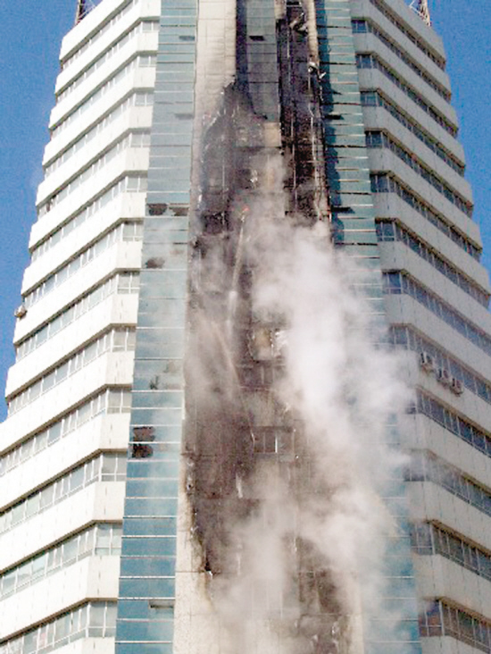 经过消防官兵的奋力扑救,发生于3月2日15时20分许的乌鲁木齐国贸大厦火灾于当日16时14分被迅速扑灭,火灾没有造成人员伤亡。这是火灾现场。 新华社记者 沙达提 摄