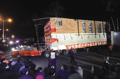 3月2日,拖车载着老别墅驶离原址。3月1日,济南市经八纬一拆迁片区,一栋有80年历史的老别墅通过拖移搬迁的方式迁往距旧址30多公里的新址“安家落户”。据了解,该建筑面积150平方米、重约200吨。 新华社记者 朱峥 摄