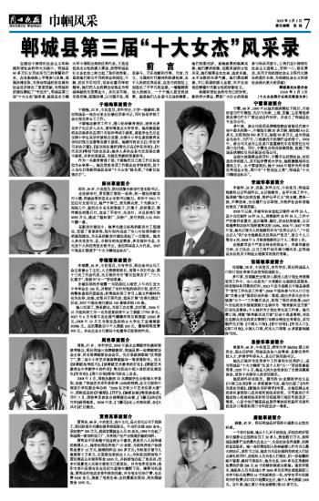 在建设中国特色社会主义和构建和谐社会的伟大实践中,郸城县60多万妇女同志用自己的智慧和汗水,在各条战线上平等参与发展,顽强拼搏进取,为推动郸城经济发展和社会进步做出了重要贡献,为郸城经济建设撑起了“半边天”。郸城县第三届“十大女杰”获奖者,就是这支巾帼大军中涌现出来的优秀代表。正是这些杰出女性的感人事迹,使得郸城县妇女在社会上树立起了良好的形象。虽然她们来自不同的职业和岗位,年龄、经历不尽相同,但却有着同样的精神。她们把人生的舞台定格在为郸城奉献的光荣事业中,并矢志不渝、无怨无悔、顽强拼搏,以自强不息、艰苦奋斗、开拓创新和自尊、自信、自立、自强的时代精神和热爱祖国、忠于人民的优秀品质,在各自的岗位上创造出了不平凡的业绩。一幅幅精彩动人的画面,一个个催人奋进的故事,就是她们人生奋斗足迹的缩影。她们刚柔相济、愈挫愈勇的飒爽英姿,她们潇洒流畅、坦荡真诚的女性风采,她们视事业如生命、追求卓越、永不言败的无畏气概,她们勇创辉煌、不让须眉的骄人业绩,无不生动地诠释着时代新女性的崭新定义。