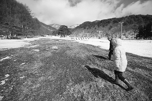 3月2日,在日本福岛县猪苗代町自由式滑雪世锦赛空中技巧的比赛场,两名居民从裸露出泥土的雪道上走过。猪苗代是日本著名的滑雪胜地及雪上赛事举办地,以雪量丰富和雪质出众而闻名。但近年来,受气候变暖影响,猪苗代的降雪量连年减少,今年更创下历史新低。随着气温的升高,赛场积雪的快速融化已影响了参赛运动员的正常训练。世锦赛正面临少雪之困。 新华社 发