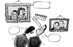 《杭州市“和谐家庭”评价成果》的调查结果显示:外来务工人员家庭在和 谐 方 面 的 满 意 度(83.46),远高于公务员或事业单位员工家庭(78.82)和蓝领工人家庭(75.80)。这一调查结果让专家大跌眼镜。报道称,这一浙江首个“家庭和谐”调查,由杭州市妇联、浙江理工大学心理研究所历时两年完成。