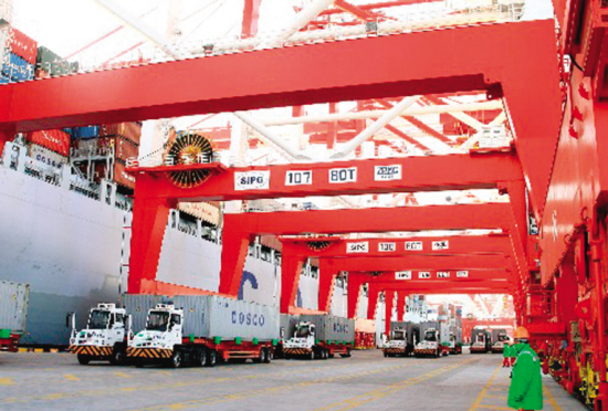 上海洋山深水港集装箱码头装卸作业正在紧张进行(2008年12月6日摄)。上海市交通港口局3月3日发布最新数据显示,2008年上海港货物吞吐量完成5.82亿吨,同比增长3.6%,继续保持世界第一。集装箱吞吐量完成2800.6万标准箱,同比增长7.1%,仍位列世界第二。新华社记者 陈飞 摄
