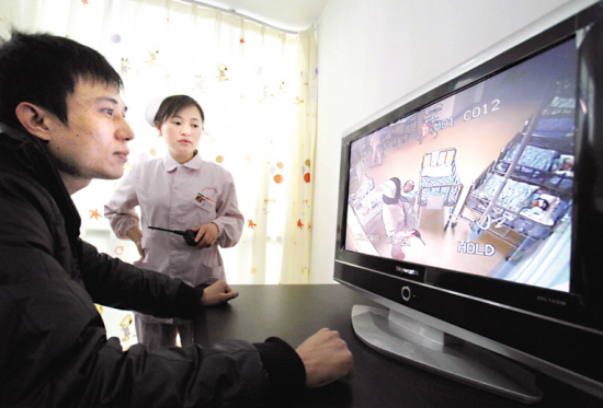 3月4日,在合肥市妇幼保健院新生儿科的视频探视室,家属通过视频探视新生儿。当日,合肥市妇幼保健院新生儿科的视频探视室正式启用,家长可免费通过医院视频探视设备“近距离”观察到婴儿的一举一动,一解对孩子的“相思之苦”。据悉,为避免受感染,在新生儿室的婴儿通常严禁家属陪伴及探视。 新华社发