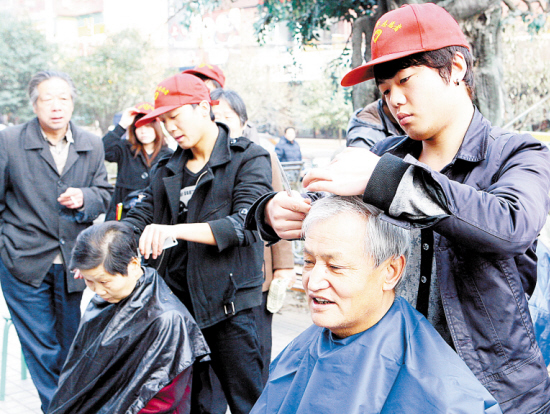 西安 3月5日,几位志愿者在西安街头为市民义务理发。当日,共青团西安市委、西安志愿者协会组织各行业的3万多名志愿者,走上街头,开展家电维修、义务理发等便民服务,以实际行动践行雷锋精神。 新华社发