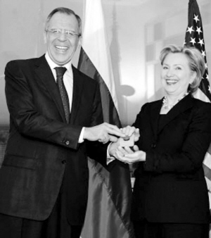 正当拉夫罗夫准备按下按钮时,希拉里提醒说:“我们需要一起来按。”现场随即笑声一片。两人在无数闪光灯下,同时按下红色按钮。按钮下面写着英文“重启”一词“Reset”,上方以俄文标记“Peregruzka”。“我们费了不少力气才找到正确的俄文单词,”希拉里说,“您觉得我们写对了吗?”拉夫罗夫直接回答:“你们写错了。”他说,俄文“重启”一词的正确拼写应是“rezagruzka”,而“Peregruzka”的意思是“超负荷”。两人放声大笑。