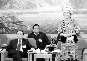 3月6日,出席十一届全国人大二次会议的重庆代表团审议政府工作报告。全国人大代表、苗族姑娘李小燕在席间唱起山歌,表达喜悦心情。