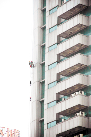 3月8日几名“蜘蛛人”正在市区最高楼——原网通大楼进行高空作业。他们系着安全带,坐在窄窄的木板上,被一根粗绳拉着由上而下,谨慎而细心地清洗着高楼的外墙。在起起落落间,高楼换新颜。