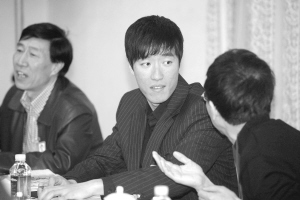 3月11日8时50分,北京21世纪饭店三层第七会议室,刘翔委员来到这里。他身着一套深色带条纹的西装,左胸部别着一张编号为1521的“出席证”。图为全国政协委员刘翔参加全国政协十一届二次会议小组讨论。新华社记者 邢广利 摄