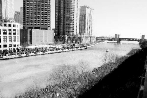 本报综合消息 3月14日,在美国芝加哥,流经市中心的芝加哥河被可食色素染成绿色。作为庆祝圣帕特里克节的一项主要内容,从1962年开始每年都有数十万芝加哥市民和游客聚在河两岸观看“染绿”河水的活动。