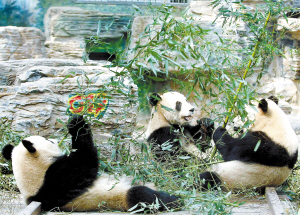 3月17日,北京动物园内的“奥运大熊猫”在吃竹子。在北京动物园生活了10个月的8只“奥运大熊猫”即将于3月22日搭乘飞机返回四川。这8只“奥运大熊猫”于2008年5月24日来到北京动物园。据统计,在北京生活期间,共有游客210万人次前去看望它们。新华社发