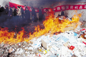本报讯 3月17日上午,在市北郊垃圾场,随着熊熊大火燃起,共190多个品种(批次)、3715盒(瓶)、货值4万多元的假劣药品被全部销毁。据了解,这是自市药监局成立以来,第八次对依法收缴、没收的假劣药品进行大规模集中销毁。部分市人大代表、市政协委员及10余家药品经营企业的代表共100余人进行了现场监督。