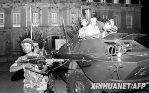 当地时间16日晚约7时,武装部队向位于市中心一座山上的总统府发起攻击,首先发射了两枚火箭弹,并鸣枪警告总统府守卫部队,随后用扩音器朝守卫部队喊话,要求他们投降。早已在总统府附近待命的两辆装甲车随即开了过来,撞开了总统府的铁栅栏门。