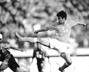 山东鲁能队球员韩鹏(右)跃起断球。3月17日,在2009年亚冠联赛小组赛F组第二轮比赛中,山东鲁能队主场以5比0战胜印度尼西亚的斯里维加亚队。