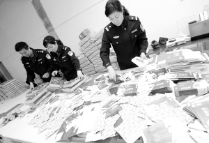 3月18日,河南省许昌市公安局魏都分局民警在涉嫌制造假药的窝点统计查获的假药、标签、药盒等。当日,魏都警方接群众举报,在市区向阳路一闲置厂房内查获一涉嫌制造假药窝点,当场查扣涉嫌假冒药品10多种,包装箱、合格证、防伪标识等共计1000多件,涉案金额达2000余万元。此案目前正在进一步调查中。新华社发