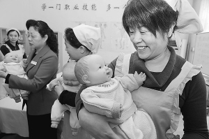 3月23日,学员张玮(右一)在青岛市妇女再就业中心学习婴幼儿护理。近日,青岛市妇联通过开设免费的育婴护理、物业管理、家政服务等20个项目的职业技能培训,多渠道拓宽妇女就业门路,两个月来,已成功帮助3000多名妇女实现就业。新华社记者 李紫恒 摄