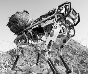 “大狗”机器人由波士顿动力学工程公司研制。这种机器狗的体型与大型犬相当,能够在战场上发挥非常重要的作用:在交通不便的地区为士兵运送弹药、食物和其他物品。它不但能够行走和奔跑,而且还可跨越一定高度的障碍物。该机器人的动力来自一部带有液压系统的汽油发动机。