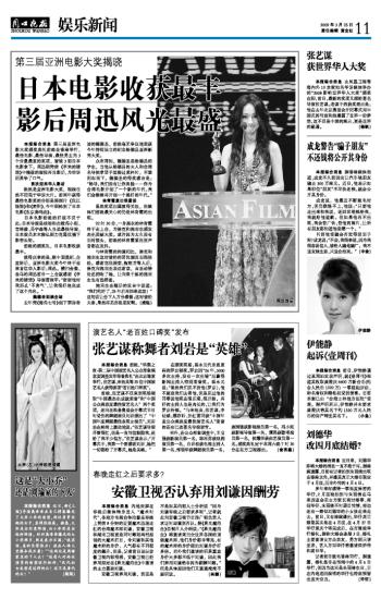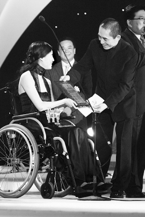 前晚,张艺谋不仅来到现场领取“中国最杰出成就荣誉”和“中国公众满意度最佳演艺名人”两个奖项,还向在准备奥运会开幕式节目时受伤的舞蹈演员刘岩颁出了“中国年度舞蹈最佳表现女演员”。刘岩坐在轮椅上激动地说:“张艺谋导演尽管很忙,但是一直写信鼓励我,还给了我不少偏方。”张艺谋表示:“开幕式中,我第一个要感谢刘岩,她把一切都给了开幕式,她是英雄。”