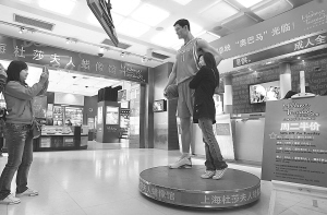 3月24日(周二),游客在上海杜莎夫人蜡像馆与姚明蜡像合影。上海18个景点门票实行“周二半价日”活动近一个月以来,揽客效应明显,其中东方明珠、野生动物园、杜莎夫人蜡像馆等景点的游客量更是周周攀升。为进一步促进消费、刺激旅游市场,“周二半价日”活动时间将延长3个月至7月28日,参与景点也将新增10家,达到28家。 新华社发