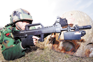 3月23日,新兵在进行激光模拟战术对抗。地处天山脚下的武警新疆边防总队乌鲁木齐新兵团针对新疆特殊的反恐形势和任务特点,在2009年度数百名新兵训练中首次引入反恐训练。他们采用公安部边防局组织研制开发的“激光模拟分队战术对抗系统”,这套系统可在模拟仿真实战条件下组织小组、分队进行对抗训练。据了解,这些新兵来自山东、湖北、甘肃和新疆四个省区,他们在这里完成三个月的基础军训和反恐训练后,将奔赴新疆边防基层部队。