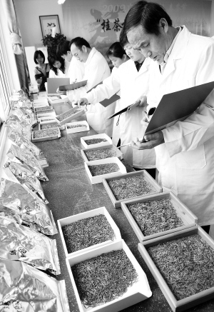 当日,第七届“桂茶杯”名优绿茶、六堡茶评比会在柳州举行,56家企业选送的101个茶叶品种参加了评比,专家对茶叶的外形、汤色、香气、滋味、叶底五个方面进行评分。新华社 发
