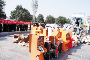 当日上午,堆放在项城市广场上的各式各样的赌博游戏机引来许多市民围观。这些机子大多为苹果机、老虎机,还有不少轮盘式的大型赌博机。9时30分,随着现场指挥人员一声令下,一台大型挖掘机轰鸣着驶向前,将76台赌博机尽数销毁(如图)。