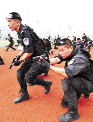 3月26日,公安特警突击队队员正在训练行进中手枪快速射击。当日,首届福建省公安特警突击队骨干特训班在福州开班。38名来自福建全省九个地市的特警突击队队员将进行为期一个月的特别训练。新华社记者 魏培全 摄