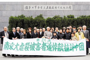 3月31日,日本第24次植树访华团成员在侵华日军南京大屠杀遇难同胞纪念馆合影。当日,日本第24次悼念南京大屠杀遇难者植树访华团一行25人在侵华日军南京大屠杀遇难同胞纪念馆举行了悼念活动,并在纪念馆的和平公园内修剪他们24年来在纪念馆所植下的树木。为表达对中国人民的歉意,日本“绿色赎罪”植树访华团自1986年来24次来南京植树6万多棵。