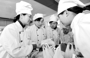 4月1日,孙洪英老师(左)在为开设“糕点公司”的学生们分析产品。日前,济南市第三职业中专在烹饪专业中开设创业辅导课程。44名学生自由组合开办了5家食品店,在学校监管和老师的辅导下自主经营,比照实体公司模式来运行,为师生们提供餐饮服务。 新华社记者 朱峥 摄