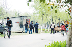 昨天中午,一辆农用四轮车把一座小铁皮房拉到市区滨河东路上。五六名男子将铁皮房卸下放在了滨河公园内的停车处,并在铁皮房周围摆上一些破旧的桌椅。一男子说,这是个“活动小卖部”。园林部门说他们不知道此事,并表示将派人去看看。