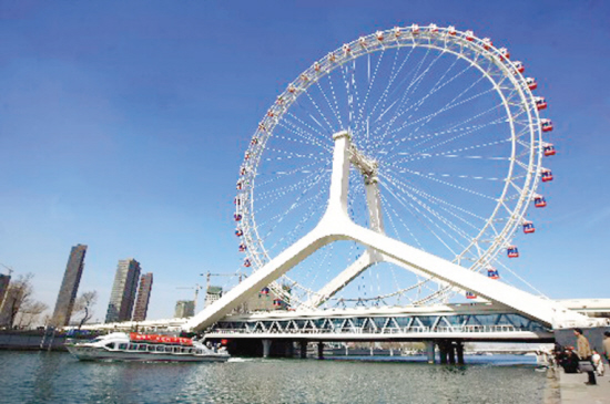 4月6日拍摄的天津永乐桥和“天津之眼”摩天轮。当日是清明小长假的最后一天,被誉为“天津之眼”的天津永乐桥摩天轮开始试运行,众多市民登高观赏津城美景。 新华社发 马志维 摄