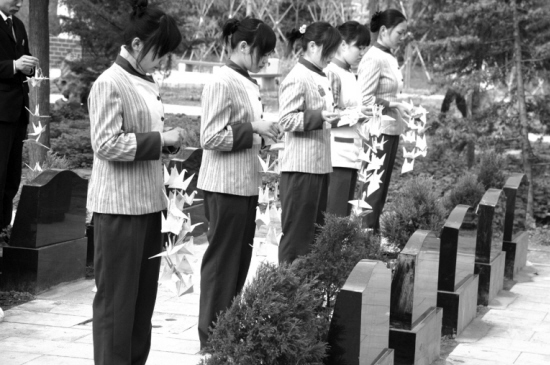 4月4日上午,在周口市革命烈士纪念馆烈士墓碑前,周口饭店的员工们把一张张用纸折成的千纸鹤献给烈士。清明节期间,周口众多市民前往革命烈士纪念馆为烈士扫墓。 晚报记者 朱海龙 摄