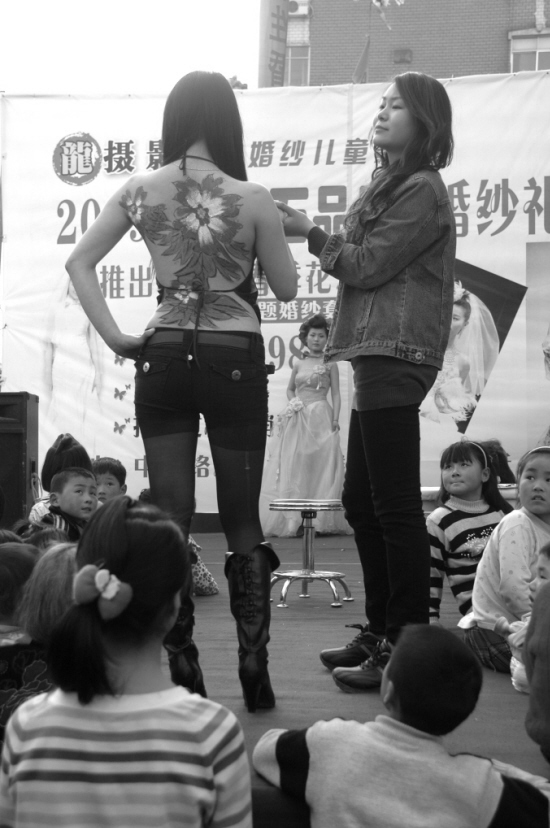 昨日,在周口市区中州路新天地步行街,为宣传婚纱文化,商家请来的专业人士现场在模特身上绘制花卉图案。这种时尚前卫的艺术形式,赚足了市民的眼球。晚报记者 朱海龙 摄