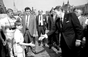 1988年,里根夫妇访问莫斯科。一直被视为苏联头号敌人的里根和妻子南希在全身心地感受莫斯科人脸上真心欢迎的笑意时,双方的敌对情绪已经有所缓解。最具有戏剧性的一幕,则发生在苏联作家协会主席卡尔波夫为里根夫妇访苏所举行的晚宴上。那天参加宴会的还有美驻苏大使马特洛克(兼当翻译)。