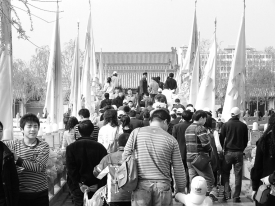 清明节放假,短途游兴起。来自黑龙江、安徽、浙江以及省内地市的游客把鹿邑老君台挤得人山人海。据了解,清明节3天假期,仅老君台景点日均接待游客近万人次。 记者 刘彦章 摄