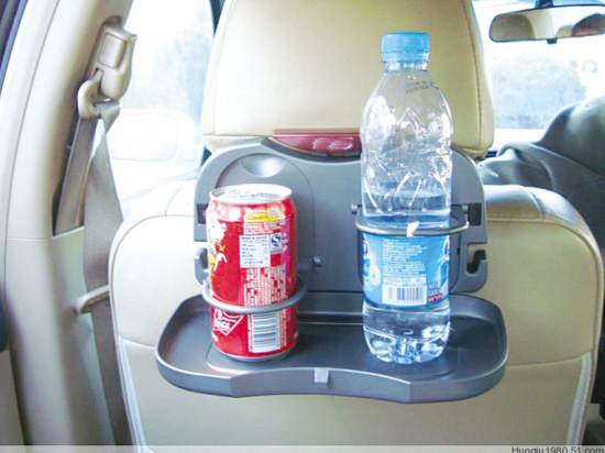 新品看台 有些车缺少储物空间,尤其是后排乘客可能会觉得没有地方放饮料等物件,在长途旅行的时候颇为不便,那么利用前排座位的背面,安装这么一个餐台,平时不用的时候,可以折起来不碍事,用的时候打开,就可以把饮料等物品放在上面,比较方便。(瑞丽)