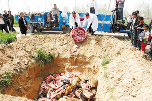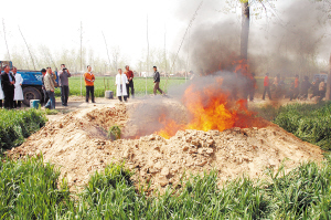 川汇区动物卫生监督所决定按照法律程序将这批死猪死狗肉直接销毁。昨天中午,这批死猪死狗肉被运往川汇区金海路办事处下口行政村一块麦地。经过消毒后,在事先挖掘的深坑内,这批问题猪狗肉被焚烧并深埋。