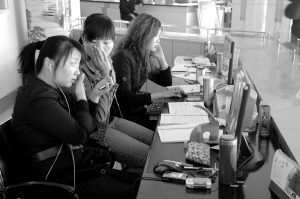 当天9时,记者来到周口市区汉阳路的市行政服务大厅一楼,看到这里的工作人员都紧盯着电脑屏幕认真“工作”。而当记者走到服务总台前却发现,里面坐着的几名工作人员竟是看在线电影、玩网络游戏,还有人边听歌边照镜子化妆(下图)。